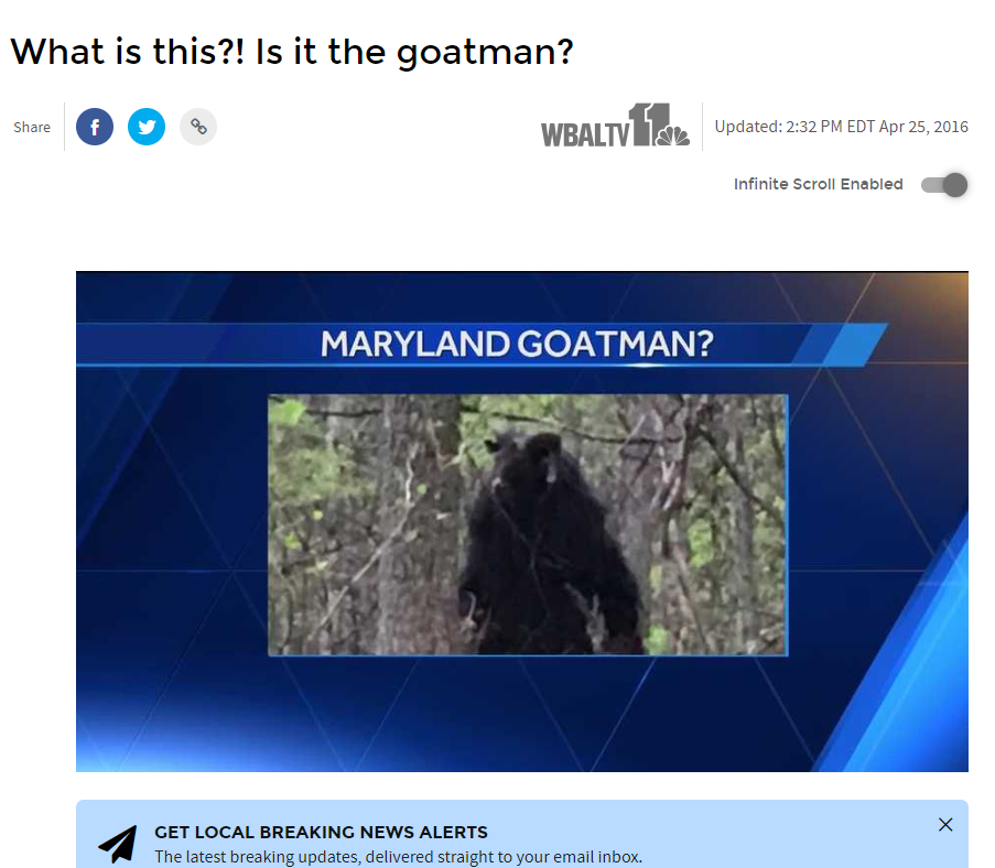 It almost looks like a goat standing on two legs.There is an old urban legend about a "goatman" who was once a scientist at the Beltsville Agricultural Research Center. The story goes that he was experimenting on goats, the experiment went awry and he began attacking cars with an ax, roaming the back roads of Beltsville.